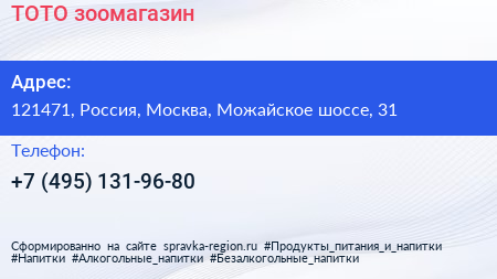 ТОТО, зоомагазин по адресу 121471, Россия, Москва, Можайское шоссе, 31 в дальнейшем Организация, размещена в следующих категориях: