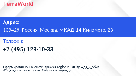 TerraWorld по адресу 109429, Россия, Москва, МКАД 14 Километр, 23 в дальнейшем Организация, размещена в следующих категориях: