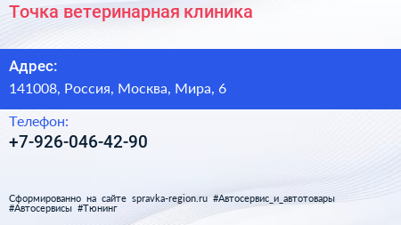 Точка, ветеринарная клиника по адресу 141008, Россия, Москва, Мира, 6 в дальнейшем Организация, размещена в следующих категориях: