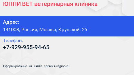ЮППИ ВЕТ, ветеринарная клиника по адресу 141008, Россия, Москва, Крупской, 25 в дальнейшем Организация, размещена в следующих категориях: