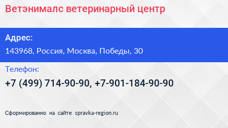 Ветэнималс, ветеринарный центр по адресу 143968, Россия, Москва, Победы, 30 в дальнейшем Организация, размещена в следующих категориях: