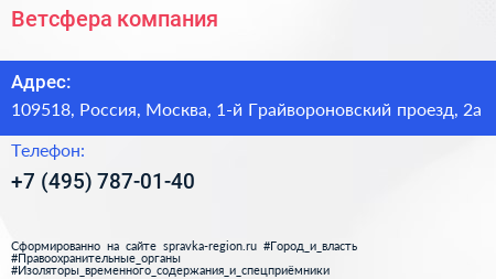 Ветсфера, компания по адресу 109518, Россия, Москва, 1-й Грайвороновский проезд, 2а в дальнейшем Организация, размещена в следующих категориях: