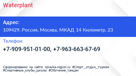 Waterplant по адресу 109429, Россия, Москва, МКАД 14 Километр, 23 в дальнейшем Организация, размещена в следующих категориях: