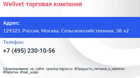 Wellvet, торговая компания по адресу 129323, Россия, Москва, Сельскохозяйственная, 38 к2 в дальнейшем Организация, размещена в следующих категориях: