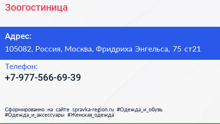 Зоогостиница по адресу 105082, Россия, Москва, Фридриха Энгельса, 75 ст21 в дальнейшем Организация, размещена в следующих категориях: