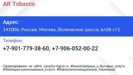 AR-Tobacco по адресу 141006, Россия, Москва, Волковское шоссе, вл38 ст1 в дальнейшем Организация, размещена в следующих категориях: