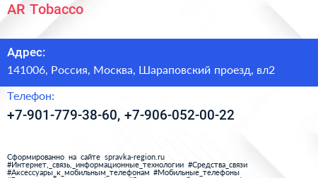 AR-Tobacco по адресу 141006, Россия, Москва, Шараповский проезд, вл2 в дальнейшем Организация, размещена в следующих категориях:
