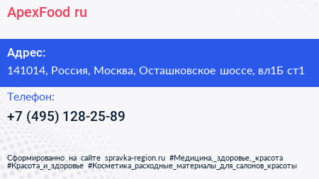 ApexFood.ru по адресу 141014, Россия, Москва, Осташковское шоссе, вл1Б ст1 в дальнейшем Организация, размещена в следующих категориях: