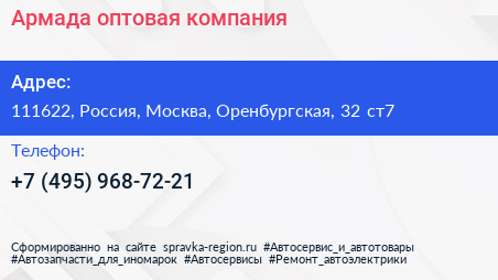 Армада, оптовая компания по адресу 111622, Россия, Москва, Оренбургская, 32 ст7 в дальнейшем Организация, размещена в следующих категориях:
