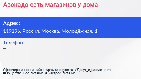 Авокадо, сеть магазинов у дома по адресу 119296, Россия, Москва, Молодёжная, 1 в дальнейшем Организация, размещена в следующих категориях: