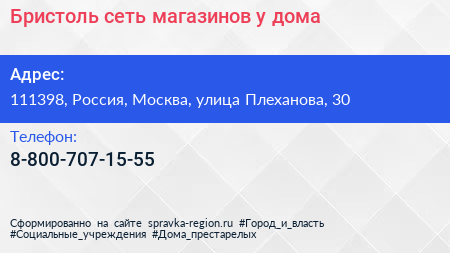 Бристоль, сеть магазинов у дома по адресу 111398, Россия, Москва, улица Плеханова, 30 в дальнейшем Организация, размещена в следующих категориях:
