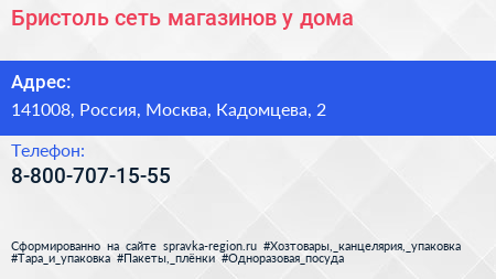 Бристоль, сеть магазинов у дома по адресу 141008, Россия, Москва, Кадомцева, 2 в дальнейшем Организация, размещена в следующих категориях: