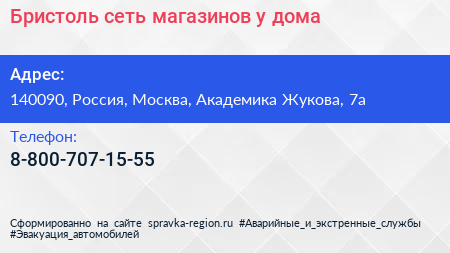 Бристоль, сеть магазинов у дома по адресу 140090, Россия, Москва, Академика Жукова, 7а в дальнейшем Организация, размещена в следующих категориях: