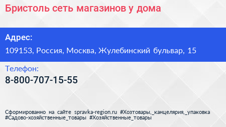 Бристоль, сеть магазинов у дома по адресу 109153, Россия, Москва, Жулебинский бульвар, 15 в дальнейшем Организация, размещена в следующих категориях: