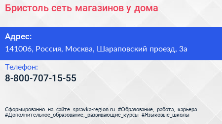 Бристоль, сеть магазинов у дома по адресу 141006, Россия, Москва, Шараповский проезд, 3а в дальнейшем Организация, размещена в следующих категориях: