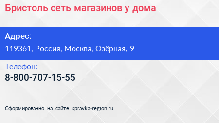 Бристоль, сеть магазинов у дома по адресу 119361, Россия, Москва, Озёрная, 9 в дальнейшем Организация, размещена в следующих категориях: