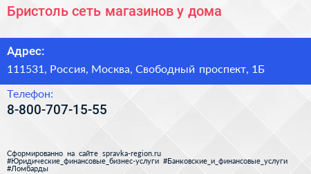 Бристоль, сеть магазинов у дома по адресу 111531, Россия, Москва, Свободный проспект, 1Б в дальнейшем Организация, размещена в следующих категориях: