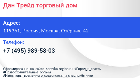 Дан Трейд, торговый дом по адресу 119361, Россия, Москва, Озёрная, 42 в дальнейшем Организация, размещена в следующих категориях: