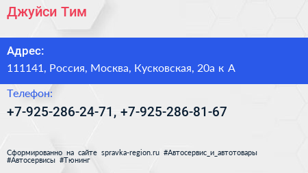 Джуйси Тим по адресу 111141, Россия, Москва, Кусковская, 20а к А в дальнейшем Организация, размещена в следующих категориях: