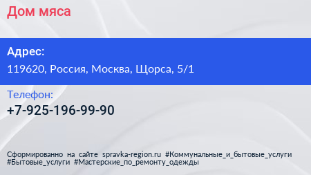 Дом мяса по адресу 119620, Россия, Москва, Щорса, 5/1 в дальнейшем Организация, размещена в следующих категориях: