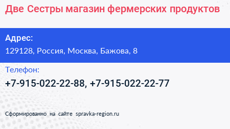 Две Сестры, магазин фермерских продуктов по адресу 129128, Россия, Москва, Бажова, 8 в дальнейшем Организация, размещена в следующих категориях: