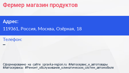 Фермер, магазин продуктов по адресу 119361, Россия, Москва, Озёрная, 18 в дальнейшем Организация, размещена в следующих категориях: