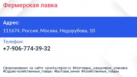 Фермерская лавка по адресу 111674, Россия, Москва, Недорубова, 10 в дальнейшем Организация, размещена в следующих категориях: