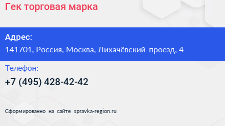 Гек, торговая марка по адресу 141701, Россия, Москва, Лихачёвский проезд, 4 в дальнейшем Организация, размещена в следующих категориях: