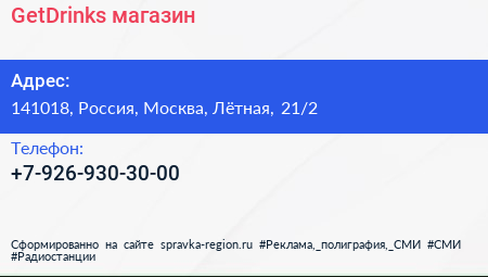 GetDrinks, магазин по адресу 141018, Россия, Москва, Лётная, 21/2 в дальнейшем Организация, размещена в следующих категориях:
