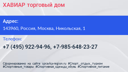 ХАВИАР, торговый дом по адресу 143960, Россия, Москва, Никольская, 1 в дальнейшем Организация, размещена в следующих категориях: