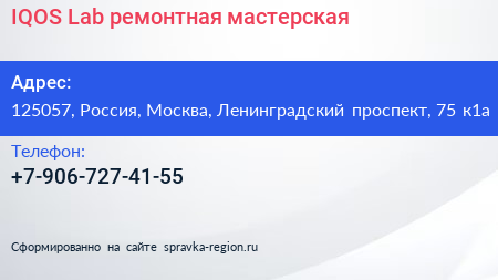 IQOS Lab, ремонтная мастерская по адресу 125057, Россия, Москва, Ленинградский проспект, 75 к1а в дальнейшем Организация, размещена в следующих категориях: