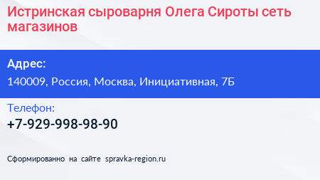 Истринская сыроварня Олега Сироты, сеть магазинов по адресу 140009, Россия, Москва, Инициативная, 7Б в дальнейшем Организация, размещена в следующих категориях: