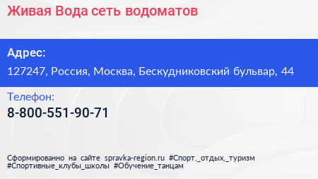 Живая Вода, сеть водоматов по адресу 127247, Россия, Москва, Бескудниковский бульвар, 44 в дальнейшем Организация, размещена в следующих категориях: