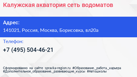 Калужская акватория, сеть водоматов по адресу 141021, Россия, Москва, Борисовка, вл20а в дальнейшем Организация, размещена в следующих категориях: