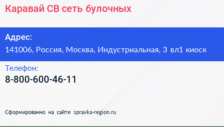 Каравай СВ, сеть булочных по адресу 141006, Россия, Москва, Индустриальная, 3 вл1 киоск в дальнейшем Организация, размещена в следующих категориях:
