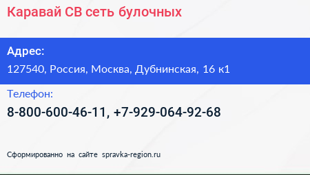 Каравай СВ, сеть булочных по адресу 127540, Россия, Москва, Дубнинская, 16 к1 в дальнейшем Организация, размещена в следующих категориях: