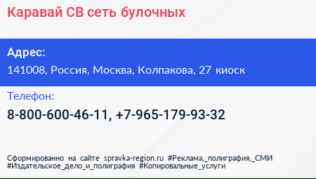 Каравай СВ, сеть булочных по адресу 141008, Россия, Москва, Колпакова, 27 киоск в дальнейшем Организация, размещена в следующих категориях: