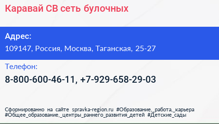Каравай СВ, сеть булочных по адресу 109147, Россия, Москва, Таганская, 25-27 в дальнейшем Организация, размещена в следующих категориях: