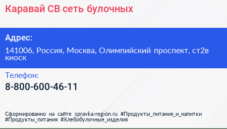 Каравай СВ, сеть булочных по адресу 141006, Россия, Москва, Олимпийский проспект, ст2в киоск в дальнейшем Организация, размещена в следующих категориях: