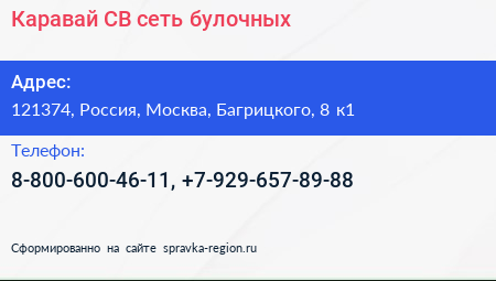 Каравай СВ, сеть булочных по адресу 121374, Россия, Москва, Багрицкого, 8 к1 в дальнейшем Организация, размещена в следующих категориях: