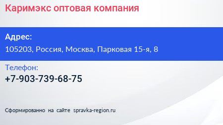 Каримэкс, оптовая компания по адресу 105203, Россия, Москва, Парковая 15-я, 8 в дальнейшем Организация, размещена в следующих категориях:
