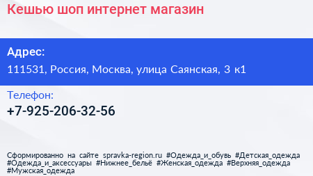 Кешью-шоп, интернет-магазин по адресу 111531, Россия, Москва, улица Саянская, 3 к1 в дальнейшем Организация, размещена в следующих категориях: