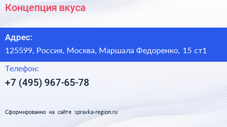 Концепция вкуса по адресу 125599, Россия, Москва, Маршала Федоренко, 15 ст1 в дальнейшем Организация, размещена в следующих категориях: