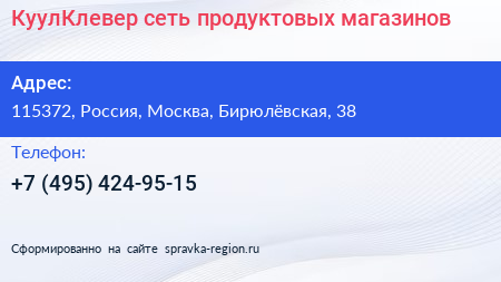 КуулКлевер, сеть продуктовых магазинов по адресу 115372, Россия, Москва, Бирюлёвская, 38 в дальнейшем Организация, размещена в следующих категориях: