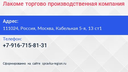 Лакоме, торгово-производственная компания по адресу 111024, Россия, Москва, Кабельная 5-я, 13 ст1 в дальнейшем Организация, размещена в следующих категориях:
