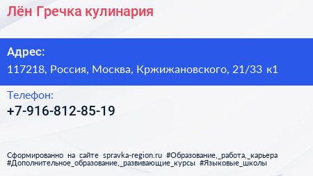 Лён-Гречка, кулинария по адресу 117218, Россия, Москва, Кржижановского, 21/33 к1 в дальнейшем Организация, размещена в следующих категориях: