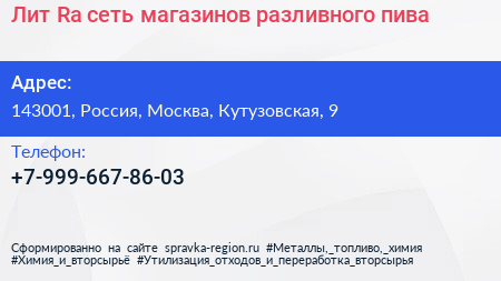 Лит.Ra, сеть магазинов разливного пива по адресу 143001, Россия, Москва, Кутузовская, 9 в дальнейшем Организация, размещена в следующих категориях: