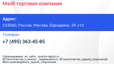 Madli, торговая компания по адресу 123060, Россия, Москва, Берзарина, 34 ст3 в дальнейшем Организация, размещена в следующих категориях: