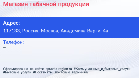 Магазин табачной продукции по адресу 117133, Россия, Москва, Академика Варги, 4а в дальнейшем Организация, размещена в следующих категориях: