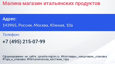 Малина, магазин итальянских продуктов по адресу 143965, Россия, Москва, Южная, 10а в дальнейшем Организация, размещена в следующих категориях: